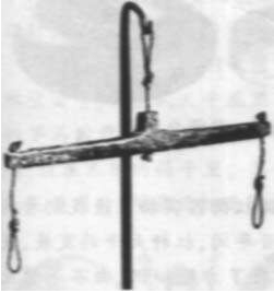 自公元前1570年以后,古埃及人的天平制作工艺有了明显的进步。如图3所示,改进后的天平靠水平穿过横梁中点的金属环挂在三角支架上。秤盘由横梁两端穿过的绳子悬挂起来,两端秤盘的受力点被固定下来,极大地提高了整个天平的灵敏度。特别值得一提的是,在天平横梁的中点处,出现了由指针和吊线铅垂组成的指示原件,使得准确校准天平横梁的平衡性成为可能。这时期,天平的称量准确度已经能够达到被称物体的千分之一。
