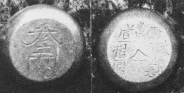 该叁两砝码直径27mm,厚15mm(原书“高15釐米”,应为笔误),重112.5g,合一斤600g。笔者所藏贰两砝码重74.6g,折算一斤为597g,基本与明、清衡制相符。