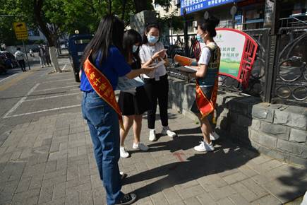 工作人员在社区发放科普材料